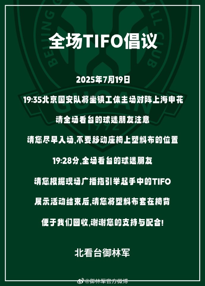 附:国安球迷组织“北看台御林军”发布的全场TIFO倡议↓